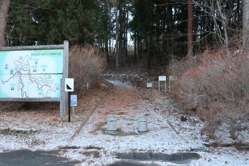 登山口へのアクセスは国道6号から県道249号線(上戸渡広野線)に入り、旅館大滝の前を通過して、「林道 五社山・黒森・大内線」で「五社山ふるさとの森」へ。林道は2000年代前半まではダートでしたが現在は完全舗装になっています。普通車、2WD車可です。終点まで進むと大きな駐車場があります。