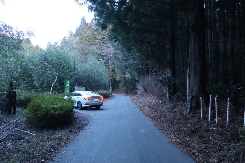 林道は1車線舗装道路です。路面が良く離合ポイントはそれなりにあるので難しくありません。路肩に落石や倒木があるのでスピードは控えめにですね。写真は下の登山口。ここから山頂まで徒歩45分程度とのこと。